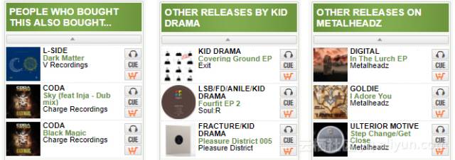 最重要的是,在每个单独的跟踪/单网页,窗口的右侧会“引荐买了这首歌曲的也会买那首歌(类似于亚马逊网站卖电子书籍)”、“艺术家的其他版本”和“其他版本的家唱片公司”,这些也是有用的。