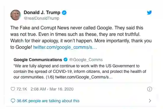 在白宫举行的每日冠状病毒新闻发布会上,特朗普总统表示,谷歌首席执行官桑达尔 · 皮查伊(Sundar Pichai)打电话向他道歉。