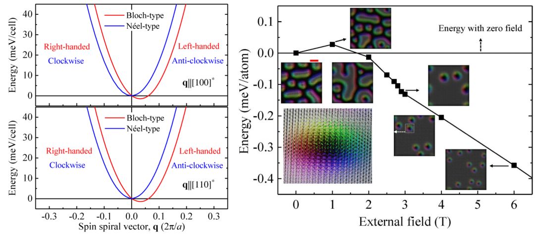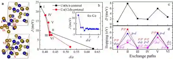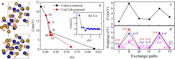 来自中国科学院宁波材料技术与工程研究所刘平研究员团队的罗湖斌博士与德国达姆斯塔特工业大学的张洪彬博士合作,通过第一原理计算发现β-Mn型钴单质具有超过1000 K的居里温度,而且,即使不存在可提供强自旋轨道耦合的重金属元素,其中两种钴近邻原子对间仍能产生强DMI。分析发现强DMI的产生与这些原子间的电子跃迁显著强于其它近邻原子对的现象密切相关,且p轨道在电子跃迁中扮演了重要角色。尽管不同位置原子的DMI能会部分抵消,能量计算表明其基态磁结构为布洛赫型的磁螺旋。根据计算获得的磁参数,自旋动力学模拟表明外加2.9 T的磁场可以让磁螺旋转变为斯格明子态。这些结果为开发高应用温区的斯格明子材料提供了重要理论参考。