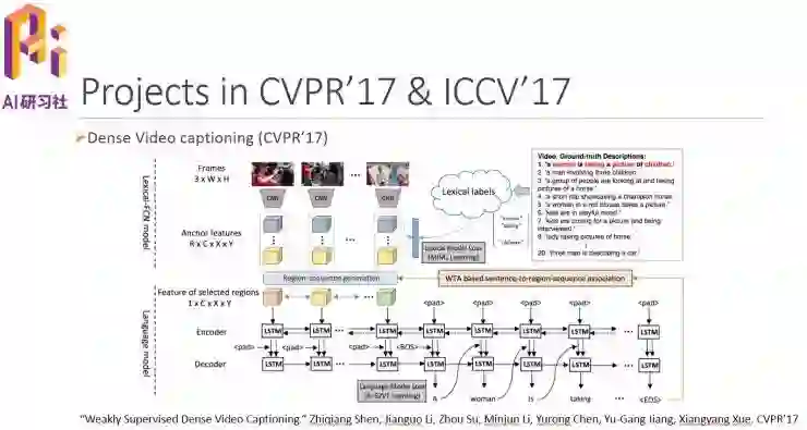最后简单介绍下我们在CVPR 2017的相关工作Dense Video captioning,主要是做视频描述。在视频当中包含很多内容,而这些内容并不一致,因此视频描述相对来说会比较困难。下图是一些示例。