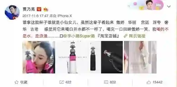 贾乃亮还曾第一时间力捧媳妇儿的新品,称之为“喝的不是水,而是浪漫”。