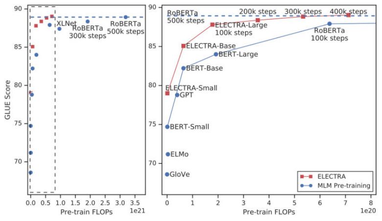 右边的图是左边的放大版,纵轴是 GLUE 分数,横轴是 FLOPs (floating point operations),Tensorflow 中提供的浮点数计算量统计。从上图可以看到,同等量级的 ELECTRA 是一直碾压 BERT 的,而且在训练更长的步数之后,达到了当时的 SOTA 模型——RoBERTa 的效果。从左图曲线上也可以看到,ELECTRA 效果还有继续上升的空间。
