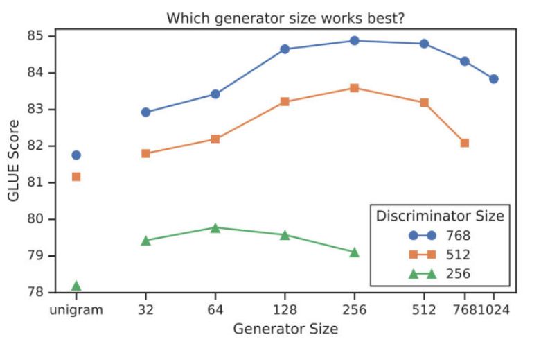 生成器和判别器的权重共享是否可以提升效果呢?作者设置了相同大小的生成器和判别器,在不共享权重下的效果是 83.6,只共享 token embedding 层的效果是 84.3,共享所有权重的效果是 84.4。作者认为生成器对 embedding 有更好的学习能力,因为在计算 MLM 时,softmax 是建立在所有 vocab 上的,之后反向传播时会更新所有 embedding,而判别器只会更新输入的 token embedding。最后作者只使用了 embedding sharing。