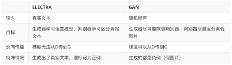 事实上,ELECTRA 使用的 Generator-Discriminator 架构与 GAN 还是有不少差别,作者列出了如下几点:
