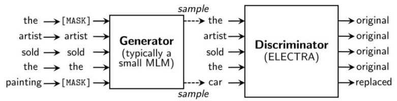 2. Replace MLM:训练 BERT MLM,输入不用 [MASK] 进行替换,而是其他生成器。这样可以消除这种 pretrain-finetune 直接的 diff。