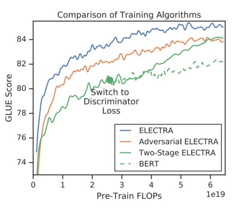 另外要注意的一点是,在优化判别器时计算了所有 token 上的 loss,而以往计算 BERT 的 MLM loss 时会忽略没被 mask 的 token。作者在后来的实验中也验证了在所有 token 上进行 loss 计算会提升效率和效果。