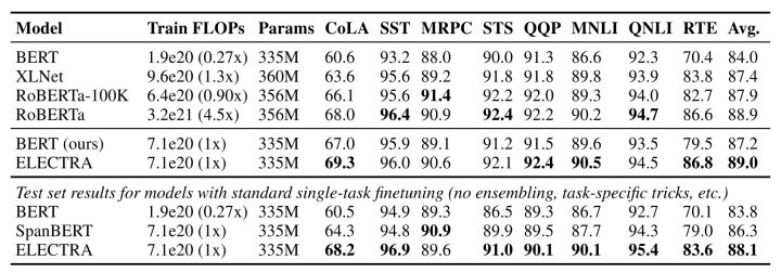 ELECTRA 通过类似 GAN 的结构和新的预训练任务,在更少的参数量和数据下,不仅吊打 BERT,而且仅用 1/4 的算力就达到了当时 SOTA 模型 RoBERTa 的效果。
