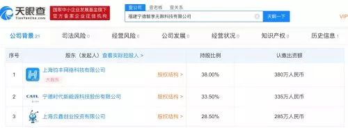 目前,宁德时代新能源科技股份有限公司持有福建宁德智享无限科技有限公司33.5%股份,上海云鑫创业投资有限公司持有28.5%股份,原股东上海钧丰网络科技有限公司持有38%股份。