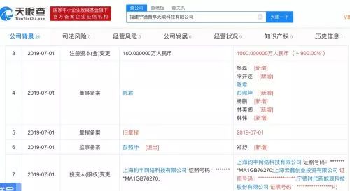 天眼查信息显示,7月1日,福建宁德智享无限科技有限公司工商信息发生变更,新增两家股东,分别为蚂蚁金服旗下上海云鑫创业投资有限公司和宁德时代新能源科技股份有限公司。