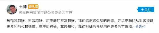 七天后,阿里巴巴集团市场公关委员会主席王帅针对此事在微头条上回应称:“至于对标谁,真没想过。我们对标的是给用户更多的可选择”。