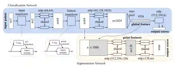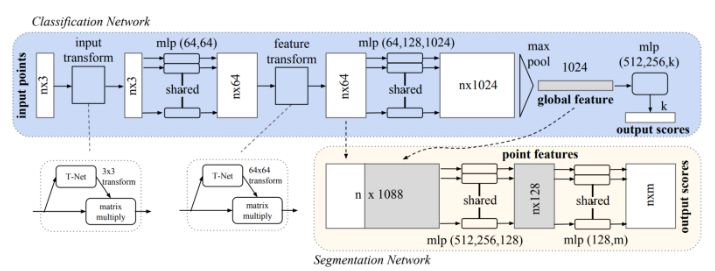 PointNet 的架构中,mlp 代表多层感知器。T-Net 是一个微小的变换网络。