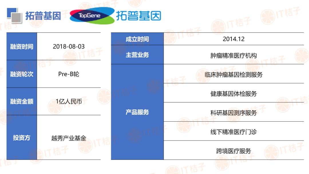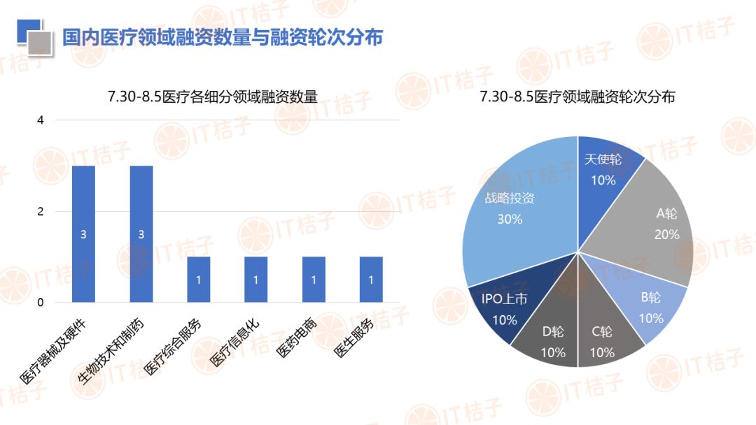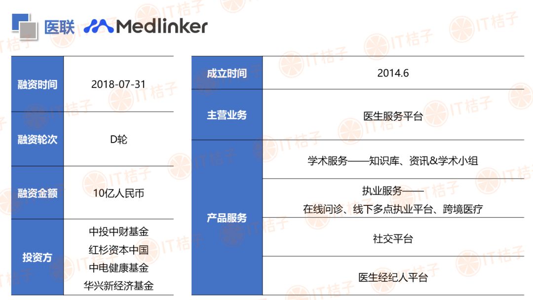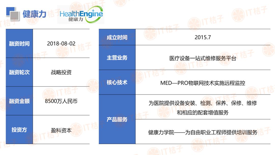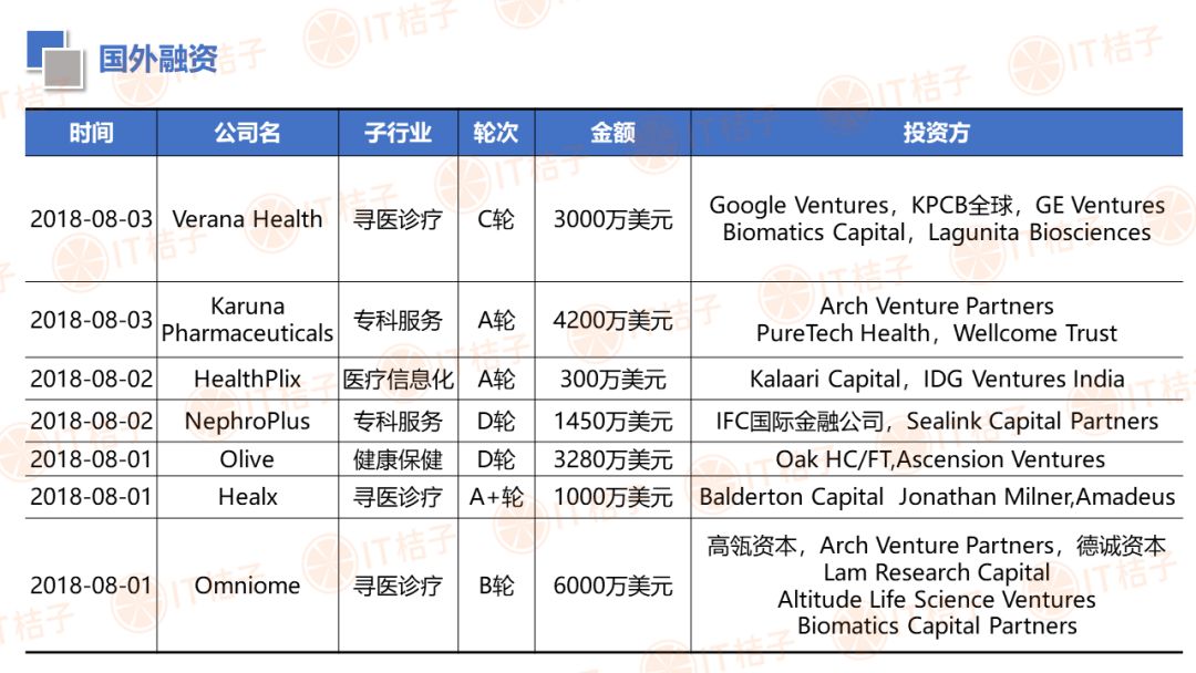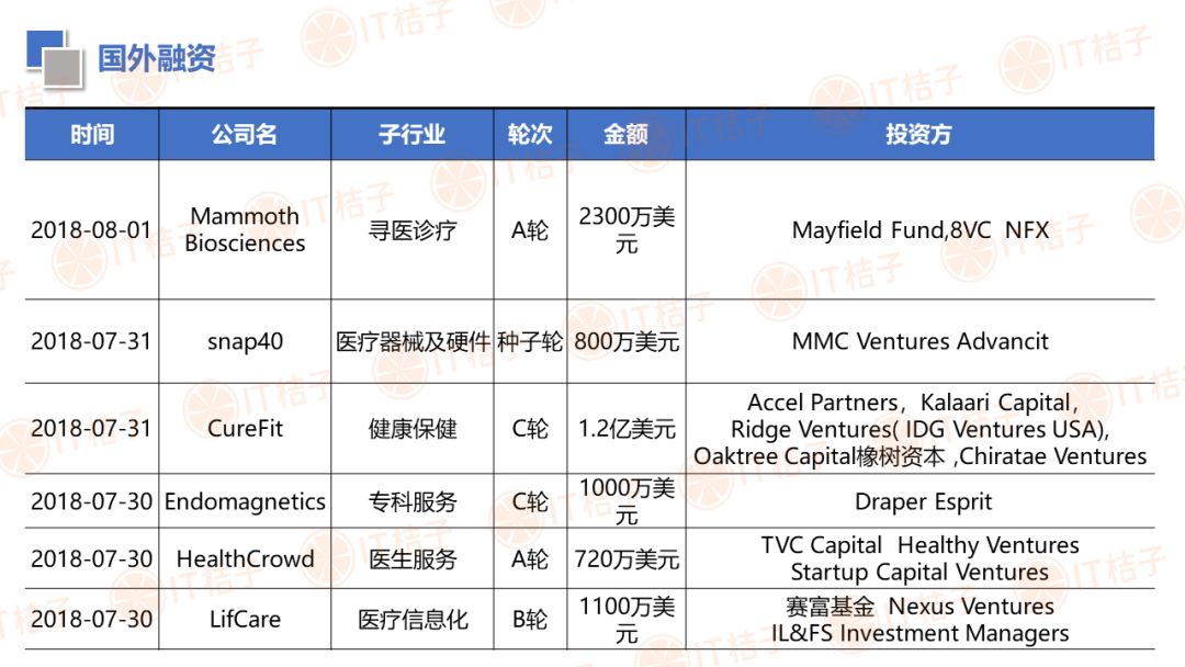IT 桔子也顺应大健康投资热潮推出了医疗健康周报和项目拆解两个新栏目。IT 桔子医疗健康周报将从投融资动作、政策风向、业内动态等解读行业最新变化。项目拆解将从企业团队建设、产品技术、市场规模、商业模式等方面挖掘企业亮点与价值,为医疗创投提供参考。