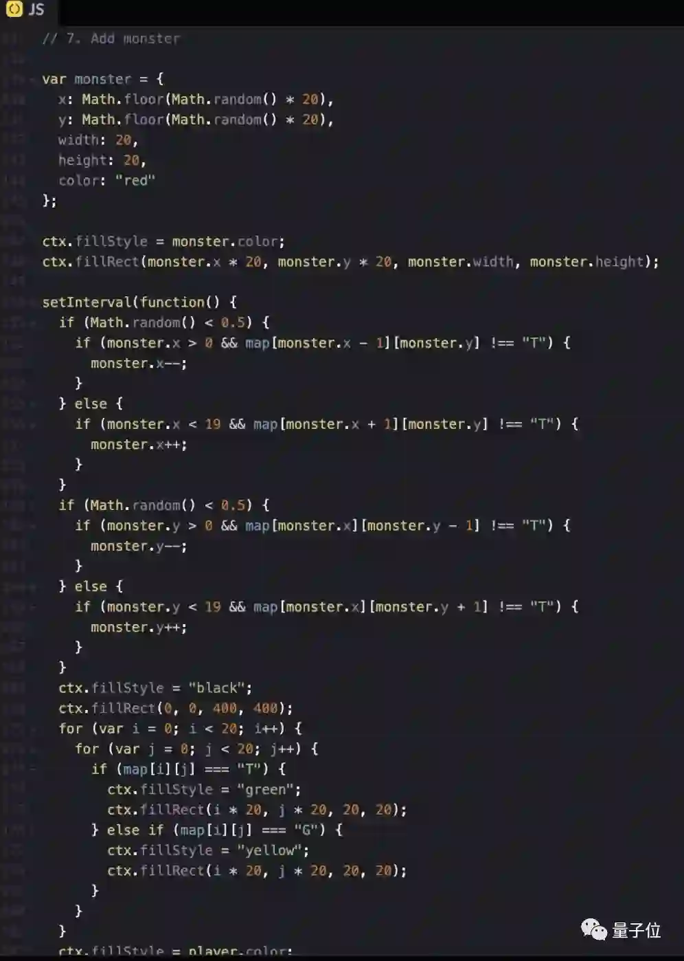 AI则根据上下文生生成了50多行完整的怪物生成、移动、判定分数的逻辑。