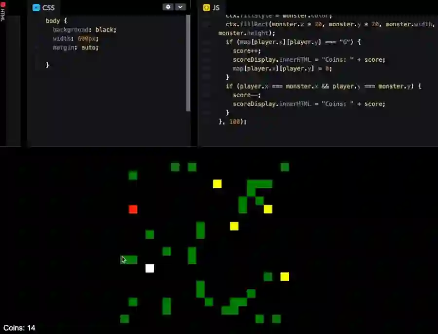 别看画面抽象,整个游戏包括随机生成地图、玩家用键盘控制角色移动、有敌人会攻击玩家、收集金币加分等游戏核心要素。