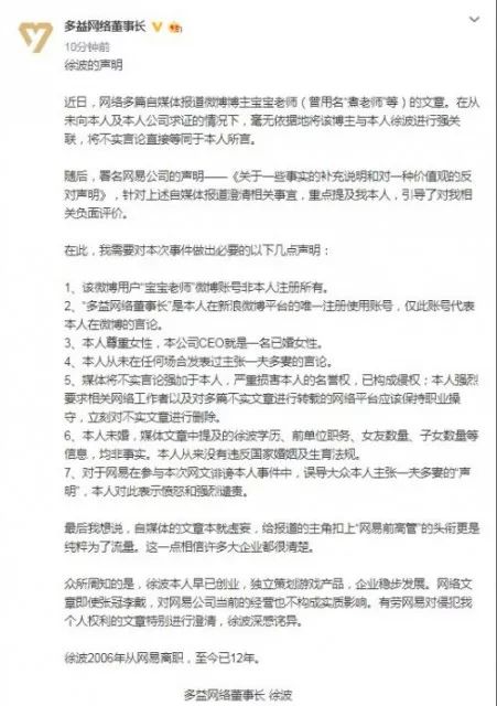 徐波声明表示,“多益网络董事长”是其在新浪微博平台的唯一注册使用账号,仅此账号代表本人在微博的言论。“宝宝老师”微博账号非本人注册所有。