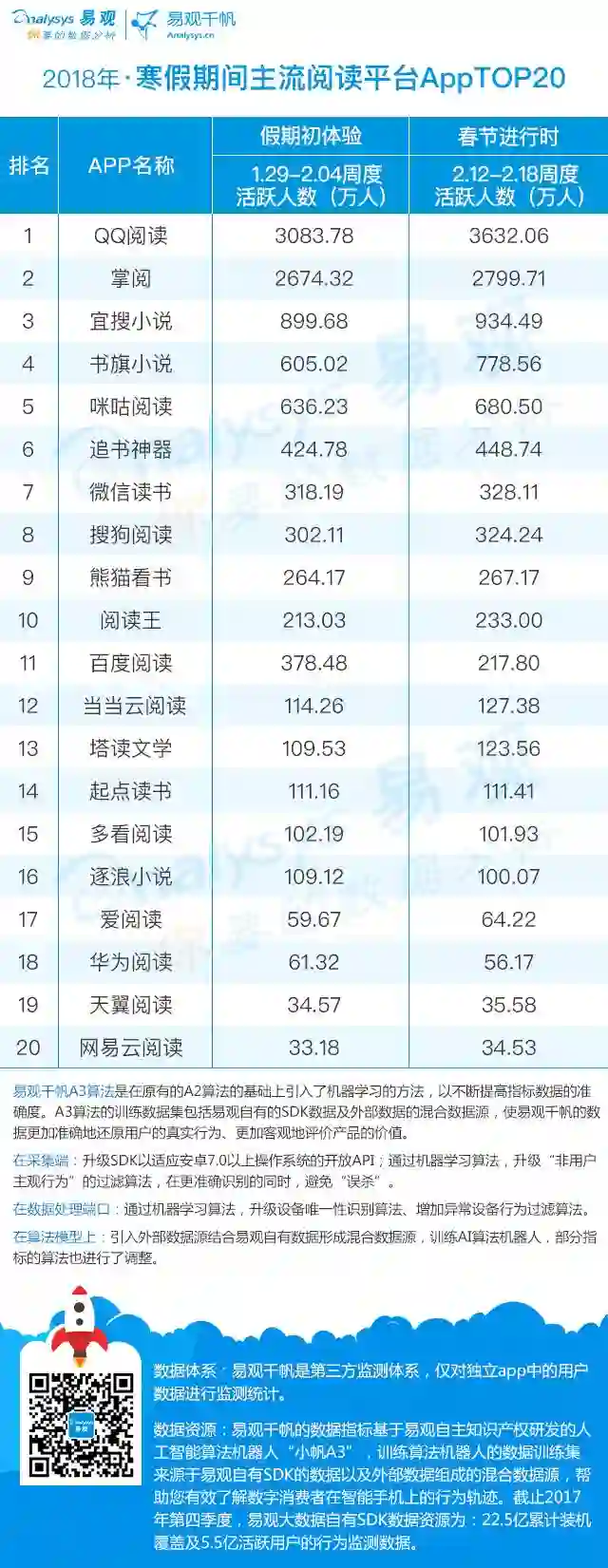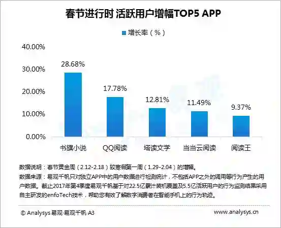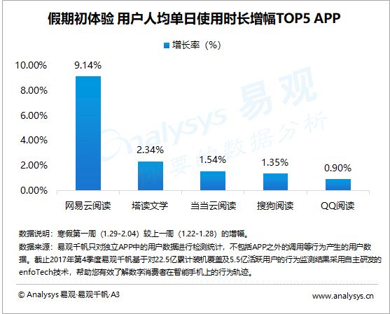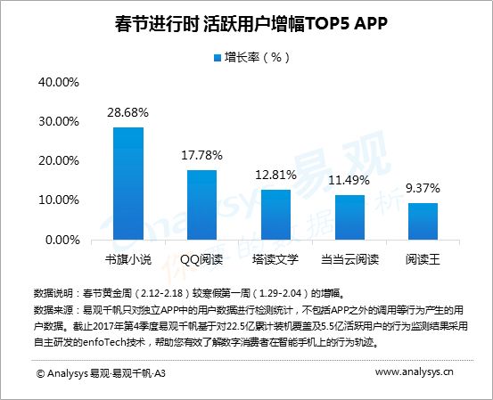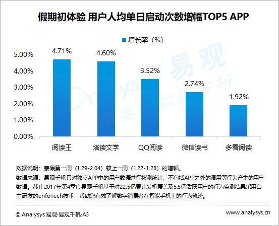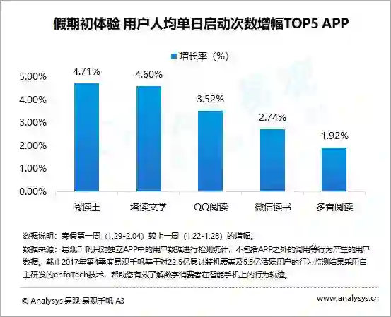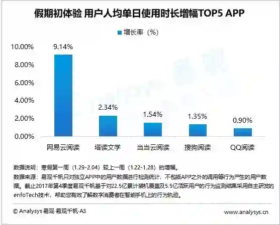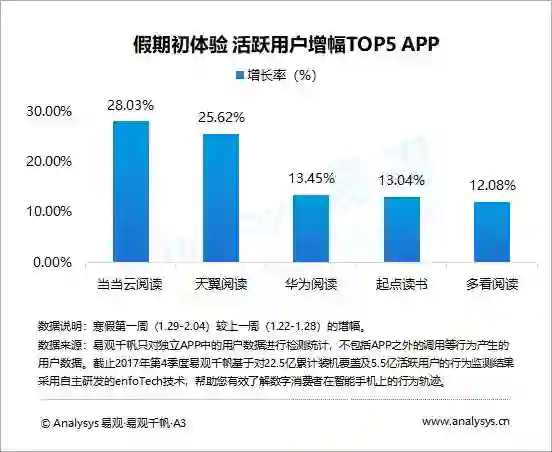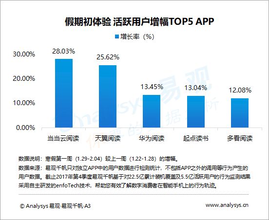 寒假初期,当当云阅读、天翼阅读、华为阅读、起点读书、多看阅读的活跃用户增幅最明显,用户娱乐需求得到释放。