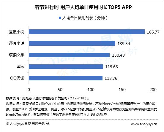 春节黄金周,头部阅读平台人均单日启动次数可高达15次,人均单日使用时长最高可达186分钟。在人均单日使用时长TOP5榜单中,平台多通过活动运营来增强用户粘性。