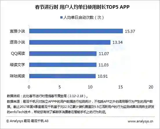 ●QQ阅读:春节期间,QQ阅读继续推出新用户送奖励活动,吸引新用户入驻。此外,由于QQ阅读平台上除文学外,还包含游戏中心、漫画、音频、活动现场、大神说、电纸书等版块,因此在春节高峰期内,QQ阅读针对以上重点板块推出活动,如:在游戏中心推出“新年贺岁 狂欢集卡”、“特价游戏 欢度新年”活动;在音频专区推出抢阅券活动等。强内容下的活动运营,帮助QQ阅读在春节期间用户粘性强势进入人均单日使用时长TOP5。