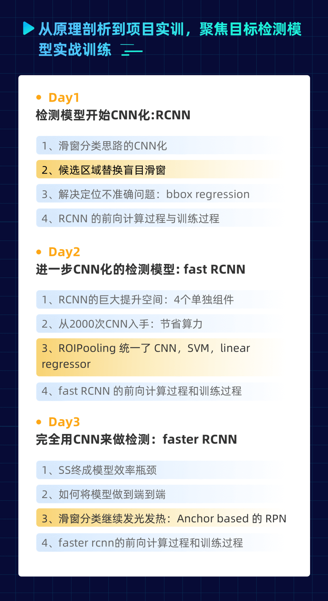 本次训练营为期3天,从RCNN到Fast RCNN,再到Faster RCNN,逐步帮你深入了解目标检测,掌握向前计算过程和训练过程。
