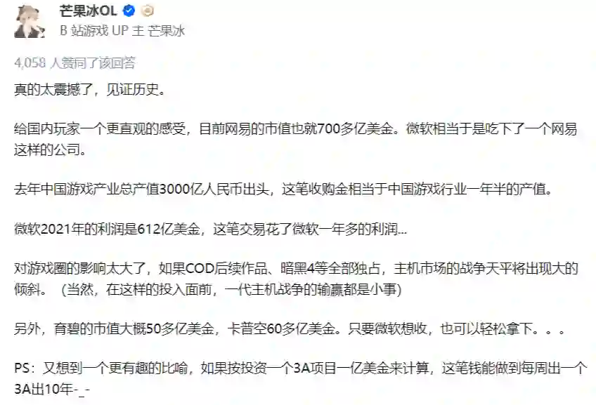 知乎用户、B站游戏up主「芒果冰OL」表示,对于这次收购,最大的感觉是震撼。微软的财大气粗让人印象深刻。