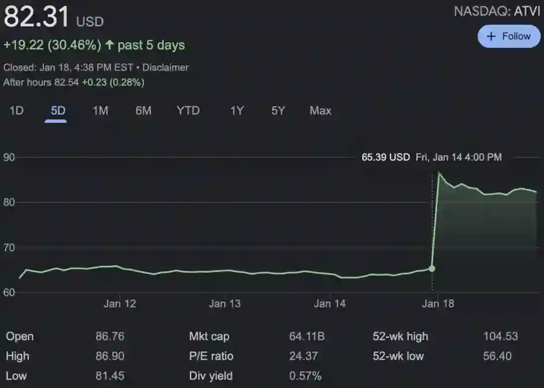 受收购消息影响,动视暴雪股价盘前一度大涨将近40%,目前收盘价较前一交易日上涨近26%,收于每股82.31美元。