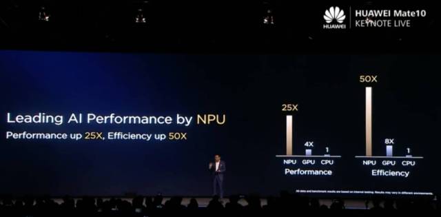 AI需要很大的计算量,发布会给出的性能是:在处理AI任务时,NPU框架能带来能效提高50倍,性能提高25倍。