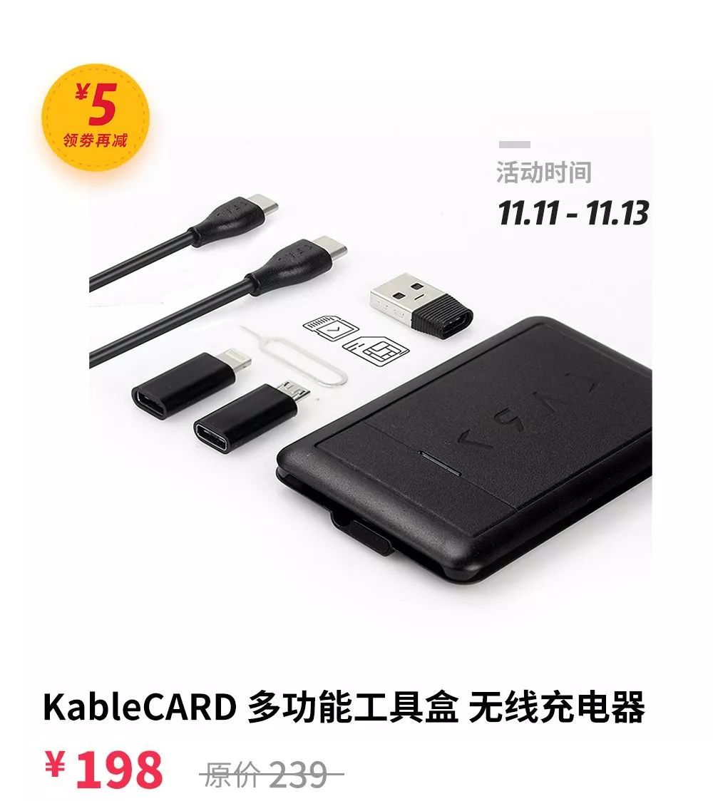 出差旅行时,剪不断理还乱的数据线着实令人心烦,而 KableCARD 这款仅有一张银行卡大小的收纳盒,不仅容下了主流接口的充电线,还能变身为手机支架、Micro SD 读卡器、SIM 卡槽、手电筒,甚至可以当成无线充电器使用。