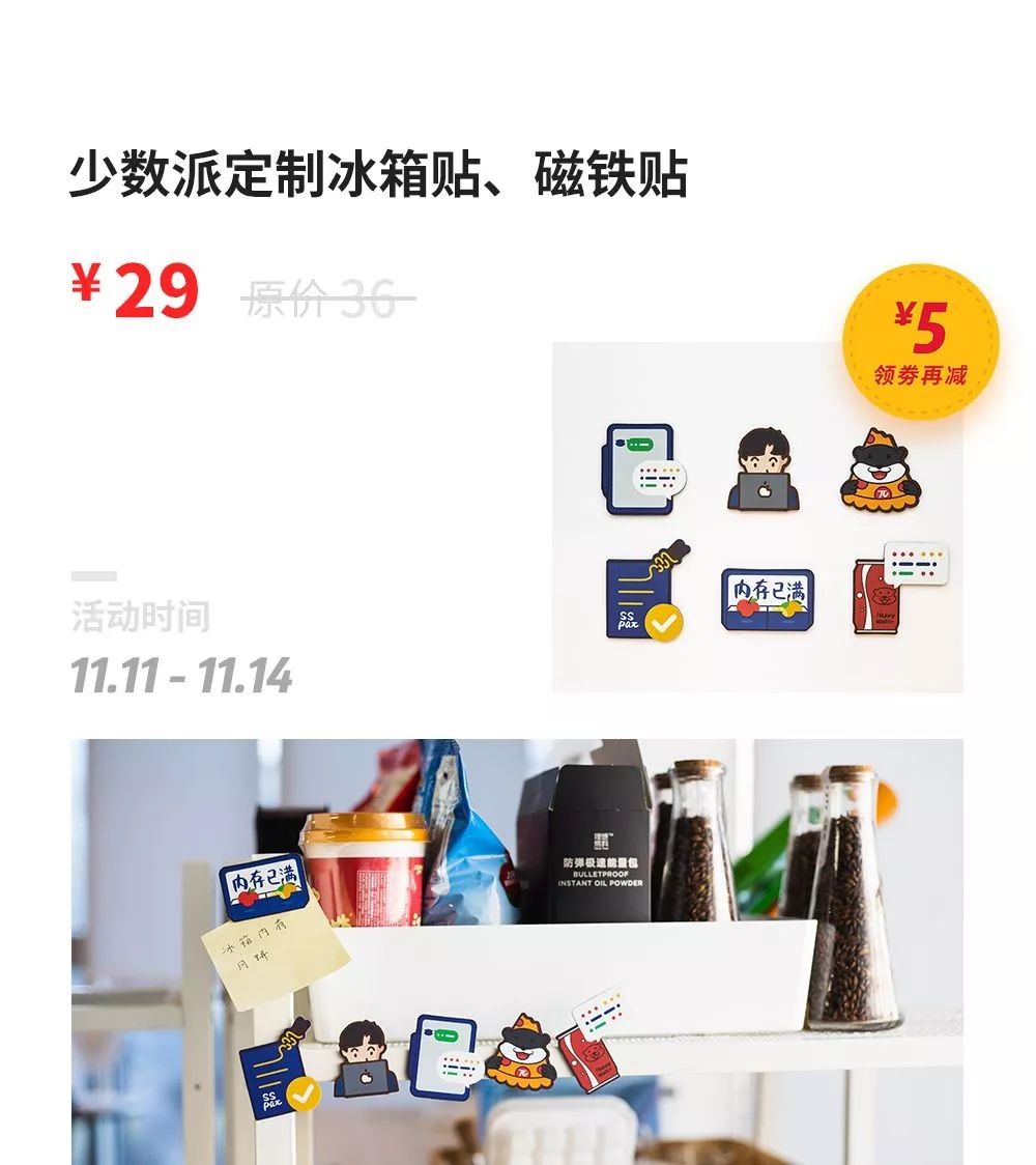 设计元素选用了既生活方式又保持一贯少数派效率。选用磁铁材质,可以用在多个场景:热爱生活的你可以贴在冰箱上、热爱工作的你可以贴在会议室黑板上……