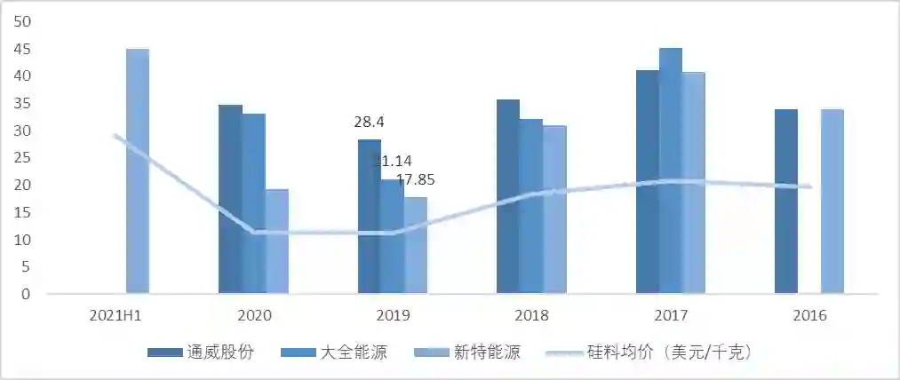 我们通过复盘通威股份、大全能源、新特能源三家公司历年的硅料业务毛利率情况,发现即使在531新政冲击后最困难的2019年,通威和大全等成本控制优秀的企业仍能维持20%以上的毛利率,而成本控制能力较差的新特能源毛利率也可以达到17.85%。