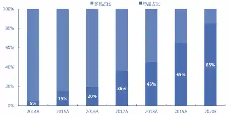 这一年,欧洲双反政策给我国光伏行业带来的剧震告一段落,全球最大的电池片生产厂商尚德电力被裁定破产。同年,隆基股份正式宣布全面推广单晶硅片,掀开单晶硅片替代多晶硅片的序幕。