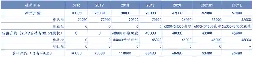 根据36氪统计,截止2021年底,保利协鑫旗下主要有徐州、新疆两大硅料生产基地,累计8万吨权益性硅料产能(其中新疆生产基地在2019年以后出售部分股权,以权益性投资核算)。此前,保利协鑫的硅料主要以自用为主,在硅片业务失去竞争力以后,开始加大外售的比例,2020年更是将公司的主业重新定位为硅料业务,外销比例达到80%以上。
