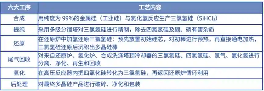 多年以来,全球硅料的生产工艺主要以改良西门子法为主,该种方法采用气相沉积的方法,生产出棒状的硅料,保利协鑫在2007年首次将这种工艺引进国内。具体来看,改良西门子法要分为合成、提纯、还原、 尾气回收、冷氢化、后处理六大工序。该种工艺具有成熟稳定、过程简单、设备标准化高等特点,生产出的硅料各方面质量均比较高,占全球份额的 97%以上。