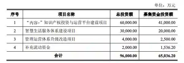 “内容“这个词也成为这场IPO的关键词汇。据招股书披露的数据,中信出版拟募集9.6亿元资金,其中6亿将用于“内容+”知识产权投资与运营平台建设项目。至于这个“内容+”项目究竟是什么,招股书里只透露了是一个包含“内容产品化、文化消费、IP运营”等项目的内容运营平台。