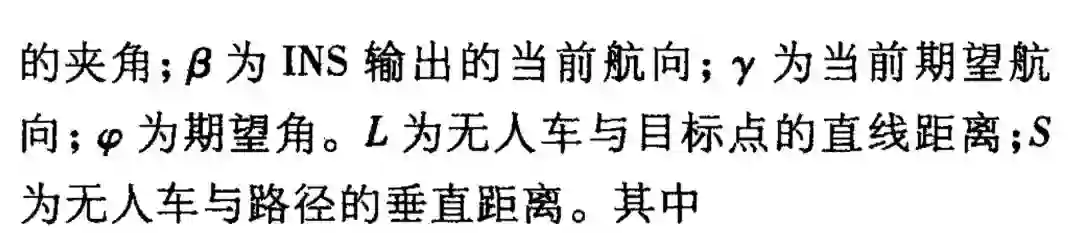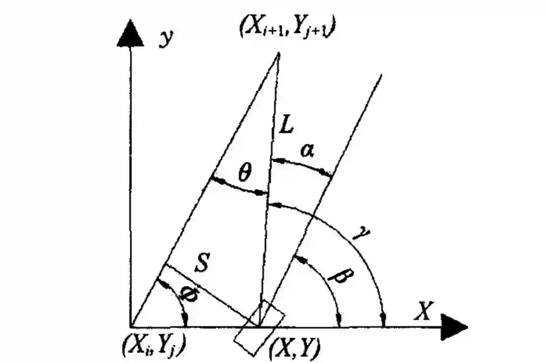 图 2 中,由 ( X_i, Y_i ) 与 ( X_(i+1), Y_(i+1) ) 构成的是理想行走路线。当前车的中心点位于 ( x, y )处,其 α、β、γ、θ 逆时针方向为正。α 为实际航向与当前期望航向的夹角;β 为 INS 输出的当前航向;γ 为当前期望航向;φ 为期望角。L 为无人车与目标点的直线距离;S 为无人车与路径的垂直距离。其中