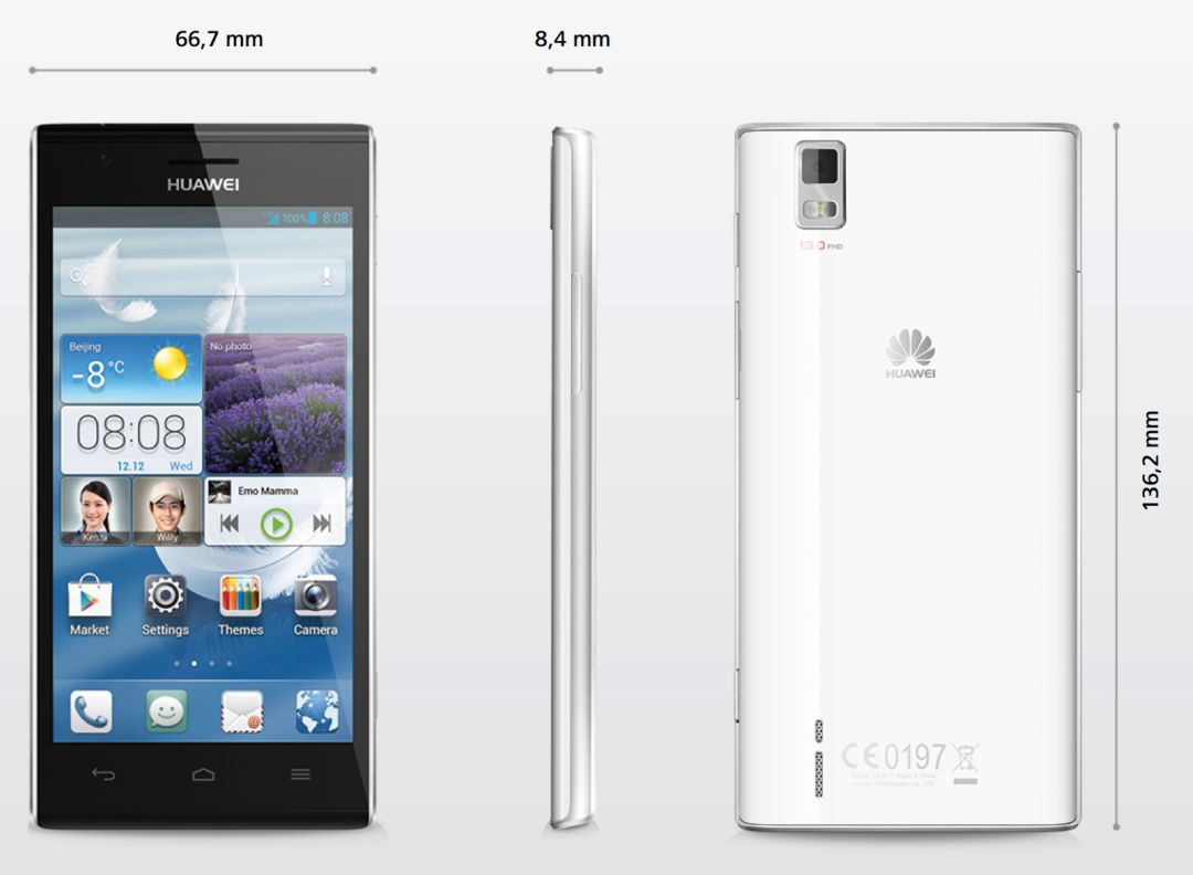 P2 的屏幕从 P1 的 qHD 分辨率升级至 720P,搭载 1300 万像素后置摄像头和基于Android 4.1.2 的 EMUI1.5 系统。机身厚度虽然来到了 8.4mm,但在当时是四核处理器手机中最为轻薄的那一类,并且 P2 的后盖做到了完全平整,配合 EMUI 的新界面整个手机有了一致性较强的设计感。