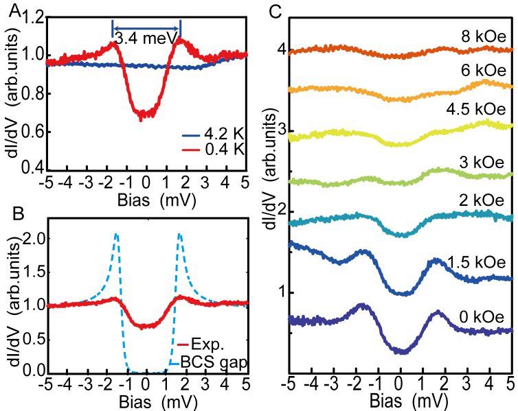 图二.扫描隧道显微镜观发现表面态的超导能隙远超过体态的超导能隙,揭示出拓扑超导的可能性。(A) 4 K和0.4 K下样品表面的微分电导dI/dV谱。在0.4 K下,超导能隙是1.7meV,远大于体态的超导能隙,且能隙与临界温度的比值约为约为8.6,远大于常规超导材料的能隙与临界温度的比值(1.76)。4 K时样品处于非超导态。(B) 0.4 K超导dI/dV谱和各向同性BCS超导谱的对比。(C) 0.4 K时,不同磁场下的超导dI/dV谱,超导能隙被外加磁场所抑制。