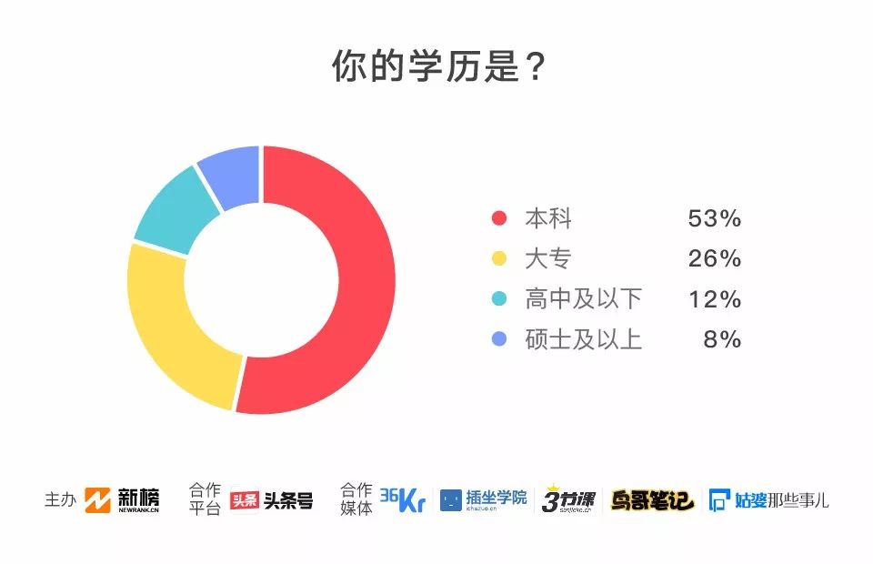 此外,有超过一半是本科学历,其次是大专以及大专以下,硕士及以上占8%。