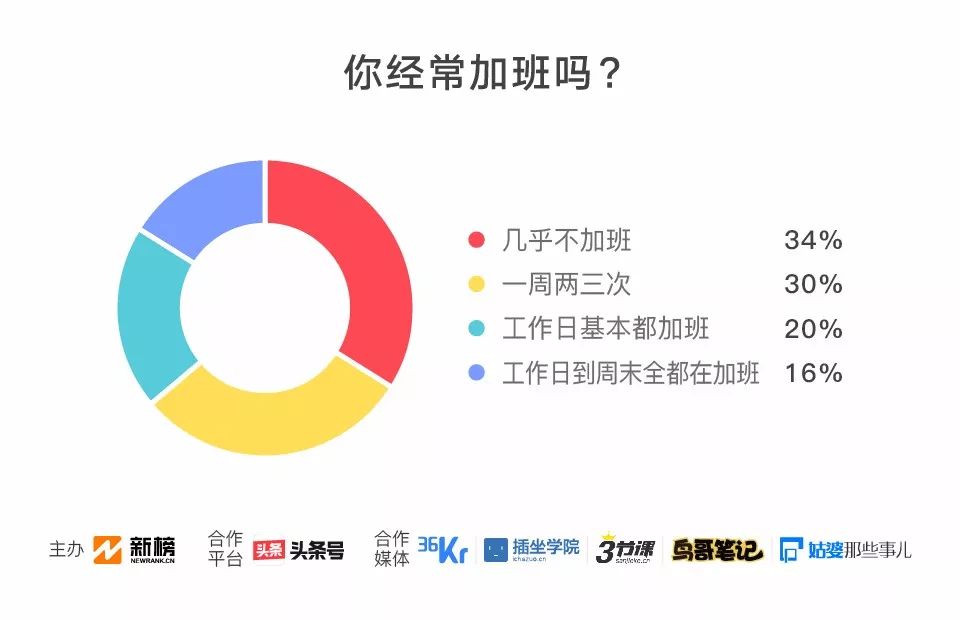 看到这里,你可能觉得“也没那么狠”,不过加班率很高。除了34%的人表示自己几乎不加班,其余多多少少都要加班,有16%的新媒体人,从工作日到周末基本全都在加班。