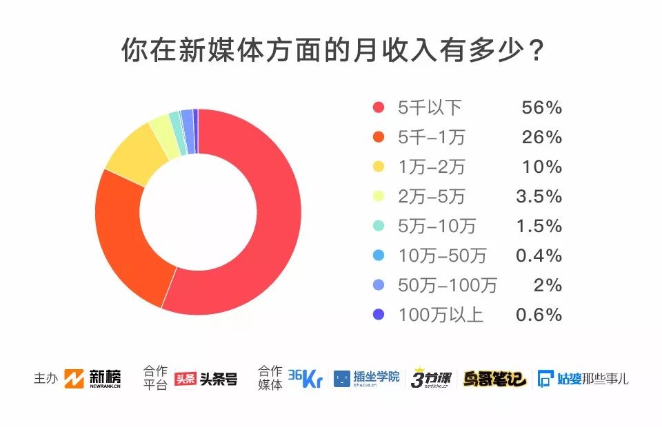 据调查数据显示,新媒体群体中月收入在5千以下的仍占一半以上,月入一万以下的占82%。但还是有2%以上的人月收入达到50万甚至百万。