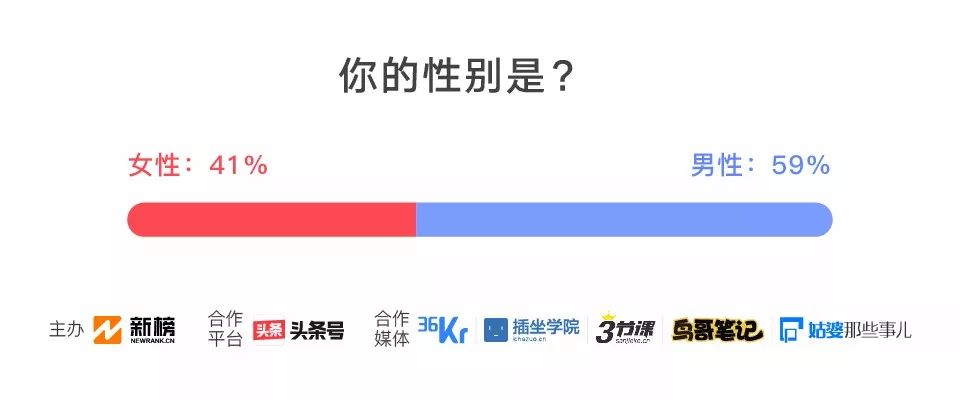据数据显示,参与填写问卷的1430位新媒体人中,男性约占59%,女性占41%(前两年的男性占比均超过70%)。
