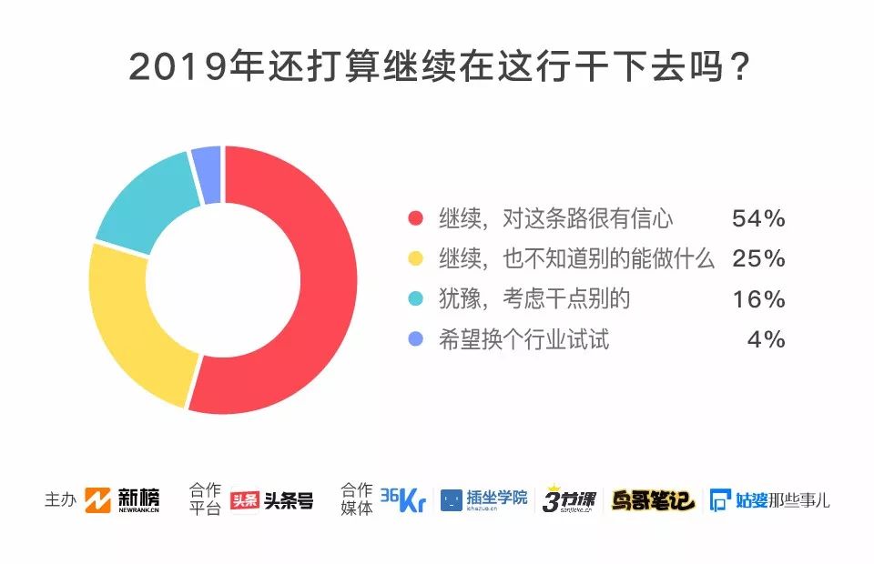 在“2019年还打算继续在这个行业干下去吗”一问中,有54%的人选择了“继续,对这条路很有信心”。