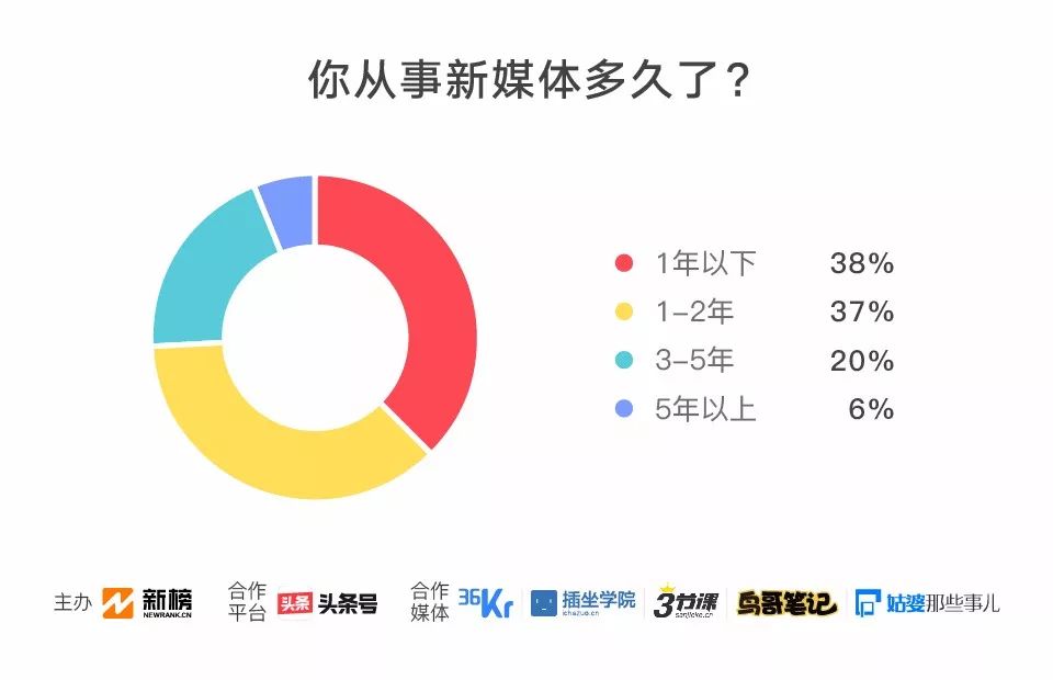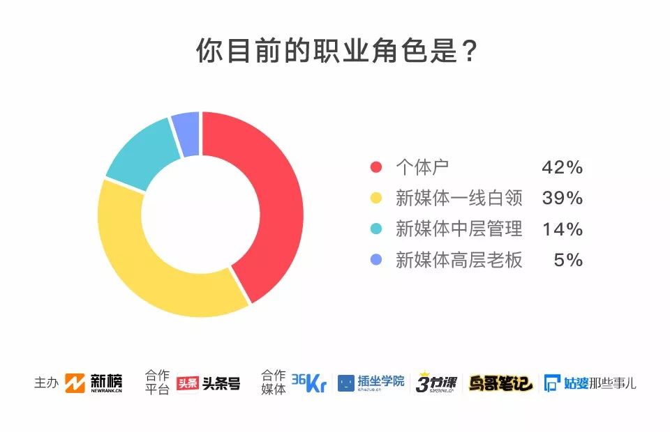 参与问卷调查的新媒体人中,有42%是个体户,也就是我们常说的个人自媒体。有39%为奋斗在创作一线的新媒体白领,我们常说的新媒体小编也在此列。其余是新媒体中高层管理者。