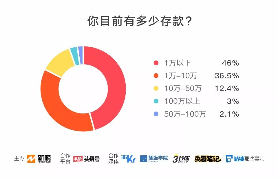 7.6%月收入1-2万,只有1.4%月入2万以上。同时,有49%的新媒体一线白领存款不足1万,存款在1万-10万的有40%,存款在50万甚至百万以上的有2%左右。
