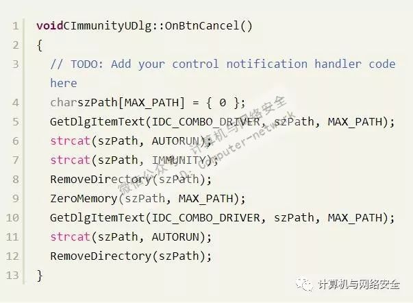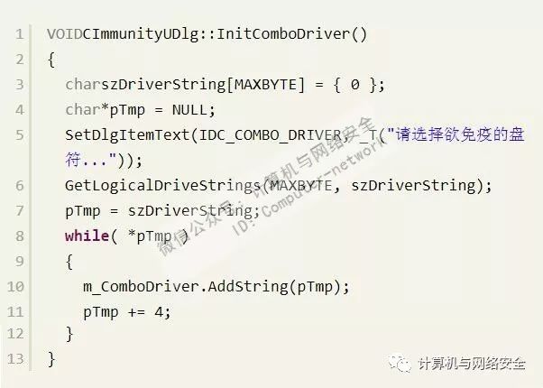 我们进行免疫时是对某个分区进行免疫的,因此要在ComboBox控件中显示出所有的磁盘分区供用户选择。在ComboBox中显示所有的磁盘分区,我们定义成一个函数来完成该功能。