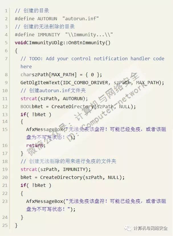 整个对Autorun进行免疫的代码就完成了,大家可以自己进行一下试验。启动我们的程序,选择需要进行免疫的盘符,单击“免疫”,打开被免疫的那个磁盘,看看是不是真的免疫了,再试着用右键删除看看效果,可以看到我们的实现是成功的。
