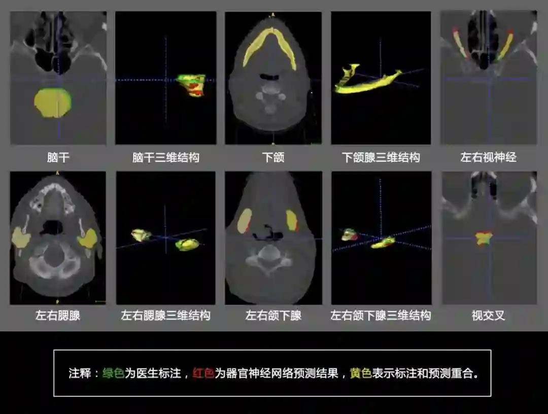 图 1 为器官神经网络危及器官分割结果,其中绿色为医生标注,红色为器官神经网络预测结果,黄色表示标注和预测重合,结果显示高度一致。