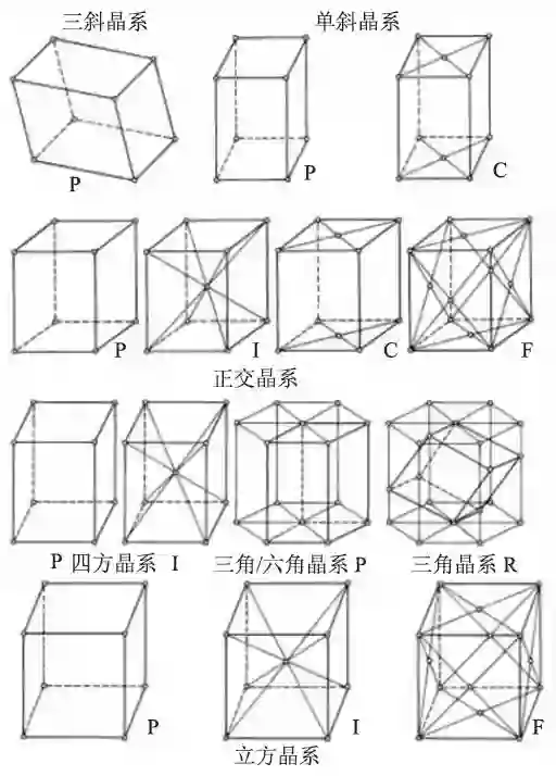 图6 从上到下按对称性排列的14 种布拉菲格子