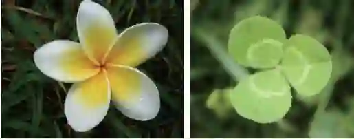 举例来说,图3 左图为鸡蛋花,五瓣,绕中心轴转2π/5 看不出曾有过转动。我们说(理想的)鸡蛋花具有C5 对称性,其对称群为C5 群。关于鸡蛋花的对称操作有转动0, 2π/5, 4π/5,6π/5 和8π/5 角这五种可能,可以验证它们满足群的定义。又比如图3右图中的三叶草,它的对称性和正三角形是一样,绕中心轴转2π/3 角相对于过顶点的中线作镜面反映(σ-操作),都看不出变化。(理想的)三叶草具有D3 对称性,其对称群为D3群。关于三叶草的对称操作有转动0,2π/3,4π/3 角和镜面反映σ1,σ2,σ3 这六种可能,可以验证它们满足群的定义。