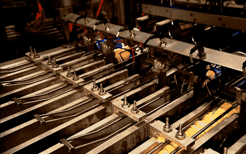被称重后,它们就被传送到纸筒前面。薯片这样被推入横着的纸筒里。