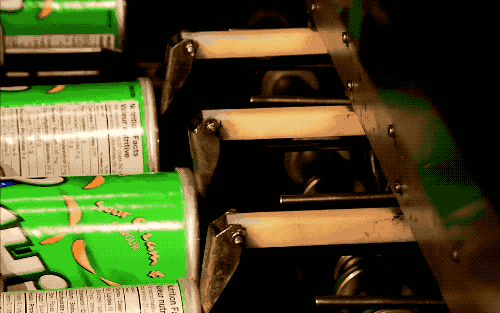 在这个翻转装置里面。所有的纸筒都会被调成同一个方向的,这就是所有桶装薯片的方向都和外包装统一的原因。